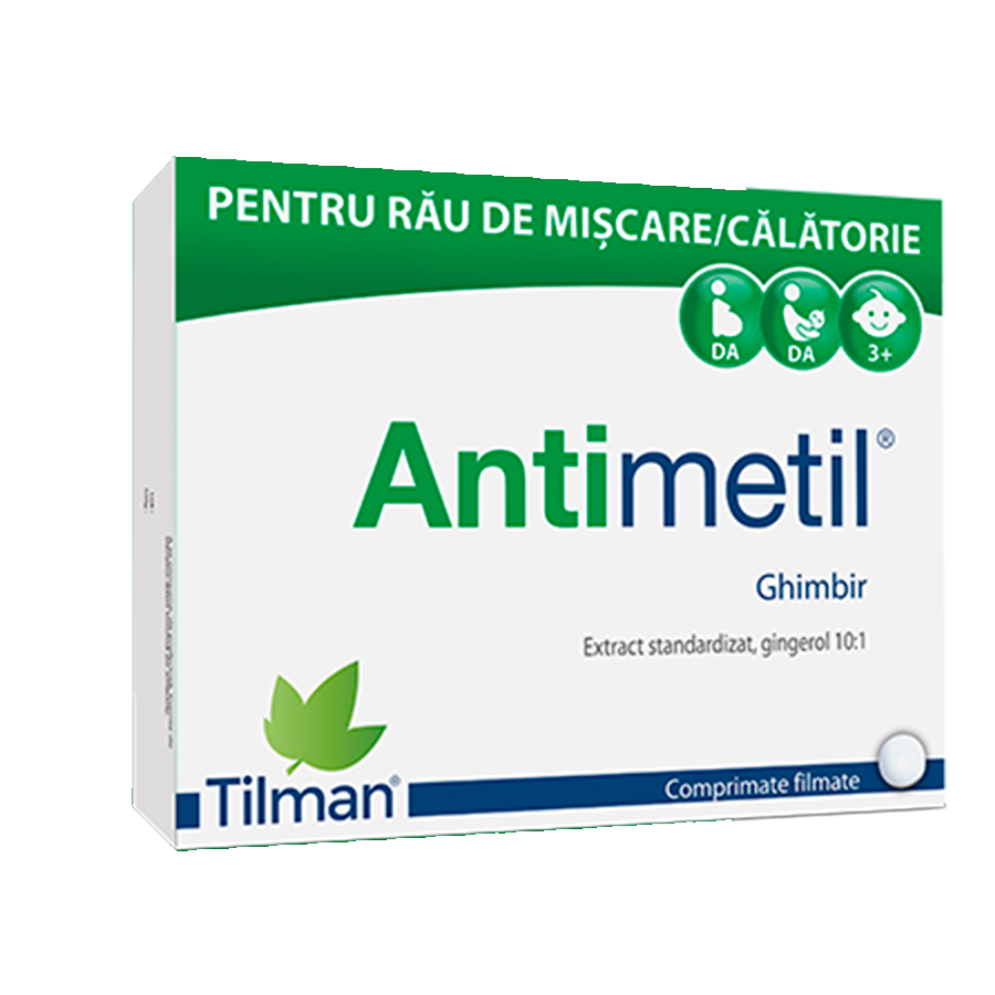 Antimetil este un supliment alimentar cu extract standardizat de ghimbir, care contribuie la buna funcționare a sistemului digestiv. Poate fi utilizat în următoarele situații: rău de mișcare/călătorie, în timpul sarcinii, consumul excesiv de alimente, întreruperea obiceiurilor alimentare.