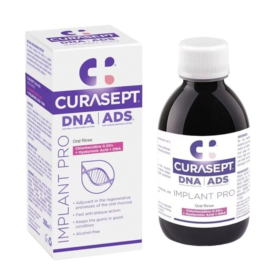 - apa de gura Curasept ADS Implant, are efect impotriva iritatiilor mecanice datorate alimentelor, impotriva infectiilor generate de microorganisme si protejeaza membranele, implaturile de titan si grefele osoase.
