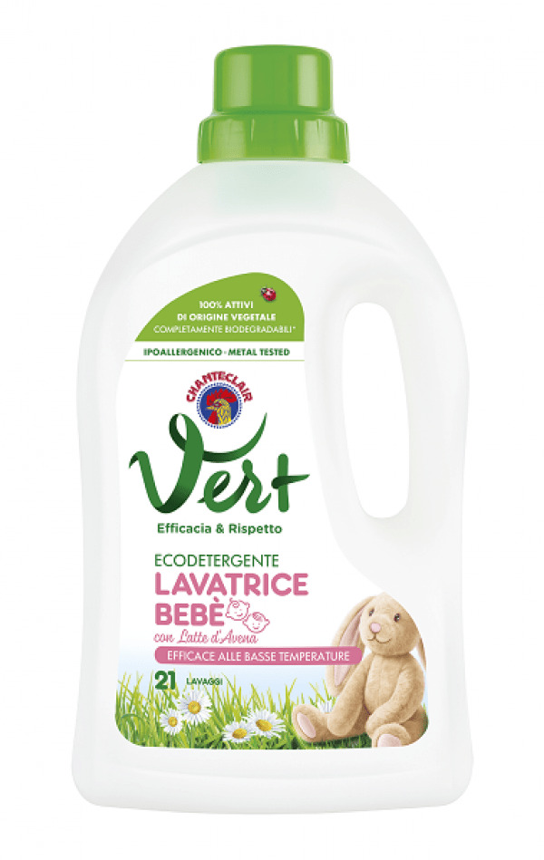 Bebè Vert detergent ecologic cu lapte de ovaz, pentru masina de spalat, 1071 ml, marca Chanteclair Vert – Real Chimica, Italia, este destinat spalarii rufelor bebelusilor. Datorita continutului de lapte de ovaz, produsul are proprietati calmante si hidratante. Formula concentrata asigura indepartarea petelor tipice copilariei chiar si la temperaturi scazute.