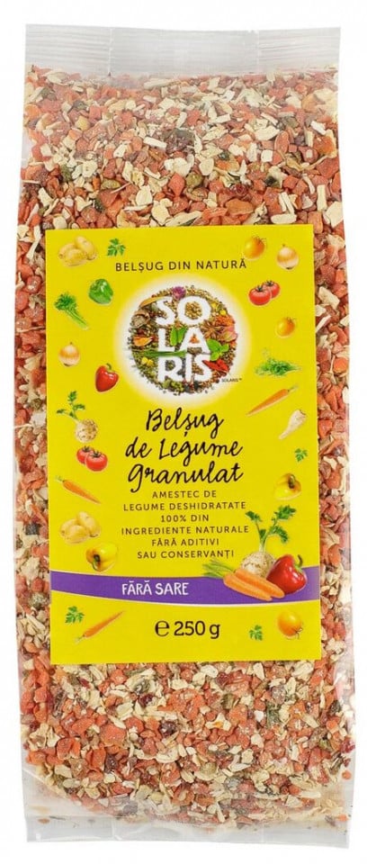 Amestec de legume uscate fara sare, granulat: morcov, telina, pastarnac, rosii, ceapa, ardei rosu, ardei verde, cartofi, patrunjel.