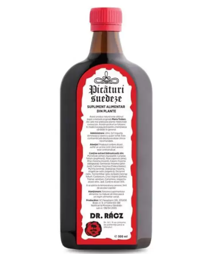 Acest produs 100 % natural este obtinut dupa o metoda originala a Mariei Treben, din cele mai pretioase plante medicinale cunoscute. Aceste picaturi suedeze se folosesc in medicina populara pentru mentinerea sanatatii, in general. Alunga durerea si ameteala, petele si cataracta, durerile de dinti, durerile de gat, crampele stomacale, durerile de urechi, durerile postnatale, febra laptelui, calmarea convulsiilor, spasmelor.