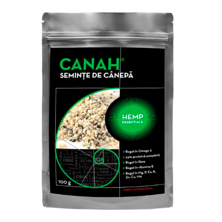 Bogatia de nutrienti continuta in miezul semintelor decorticate de canepa consta intr- un procent generos de proteina vegetala, acizi grasi polinesaturati, vitamine (B1, B3, B6 si E) si minerale (fosfor, potasiu, magneziu, fier, zinc, cupru si mangan). Semintele decorticate de canepa 100 g Hemp Essentials sunt obtinute fara utilizarea substantelor chimice, fara interventii genetice si care se afla in armonie cu natura si mediul inconjurator. Semintele decorticate de canepa 100 g Hemp Essentials sunt un produs Canah, realizat intr-un sistem de management al sigurantei alimentare codificat ISO 22000 certificat de TÜV Rheinland. Produsul este impachetat in ambalaje cu certificare „food grade” (destinate ambalarii produselor alimentare), care permit resigilarea prin inchiderea tip „fermoar”.