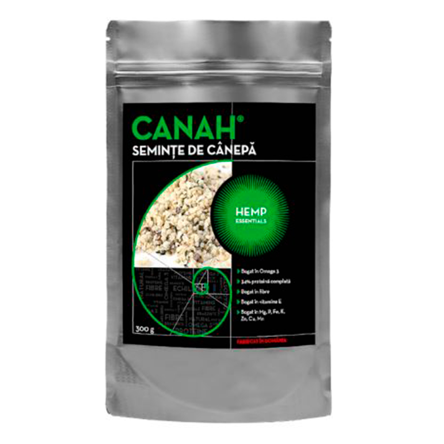 Bogatia de nutrienti continuta in miezul semintelor decorticate de canepa consta intr- un procent generos de proteina vegetala, acizi grasi polinesaturati, vitamine (B1, B3, B6 si E) si minerale (fosfor, potasiu, magneziu, fier, zinc, cupru si mangan). Semintele decorticate de canepa 300 g Hemp Essentials sunt obtinute fara utilizarea substantelor chimice, fara interventii genetice si care se afla in armonie cu natura si mediul inconjurator. Semintele decorticate de canepa 300 g Hemp Essentials sunt un produs Canah, realizat intr-un sistem de management al sigurantei alimentare codificat ISO 22000 certificat de TÜV Rheinland. Produsul este impachetat in ambalaje cu certificare „food grade” (destinate ambalarii produselor alimentare), care permit resigilarea prin inchiderea tip „fermoar”.