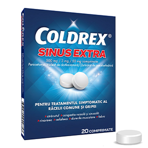 Coldrex Sinus Extra este indicat pentru tratamentul simptomatic al rӑcelii comune şi gripei (pentru ameliorarea strӑnutului, rinoreei, congestiei nazale şi sinusale, febrei, durerilor de cap şi durerilor musculare).