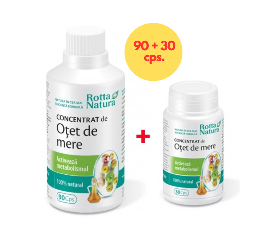 Concentratul de Otet de mere, 90 + 30 capsule, produs de Rotta Natura, Romania, este conceput pentru un efect intensiv asupra procesului de slabire, fiind solutia eficienta in managementul masei corporale datorita capacitatii sale de a intensifica metabolismul si de a reduce apetitul. Formula contine vitaminele B si E, esentiale in procesul de slabire intrucat, cu ajutorul lor, organismul foloseste corect caloriile si elimina poftele alimentare (indeosebi de carbohidrati) cauzate de carentele nutritionale.