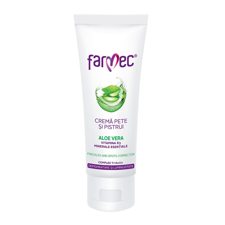 - crema de fata Pete si Pistrui Farmec contine substante cu actiune peeling (acizi din fructe AHA), de decolorare (Vitamina B3) si antioxidanta (complex Ferulan, Complex mineral MgCuZn), cu efect de decolorare si atenuare a pistruilor si a petelor de pigmentatie.