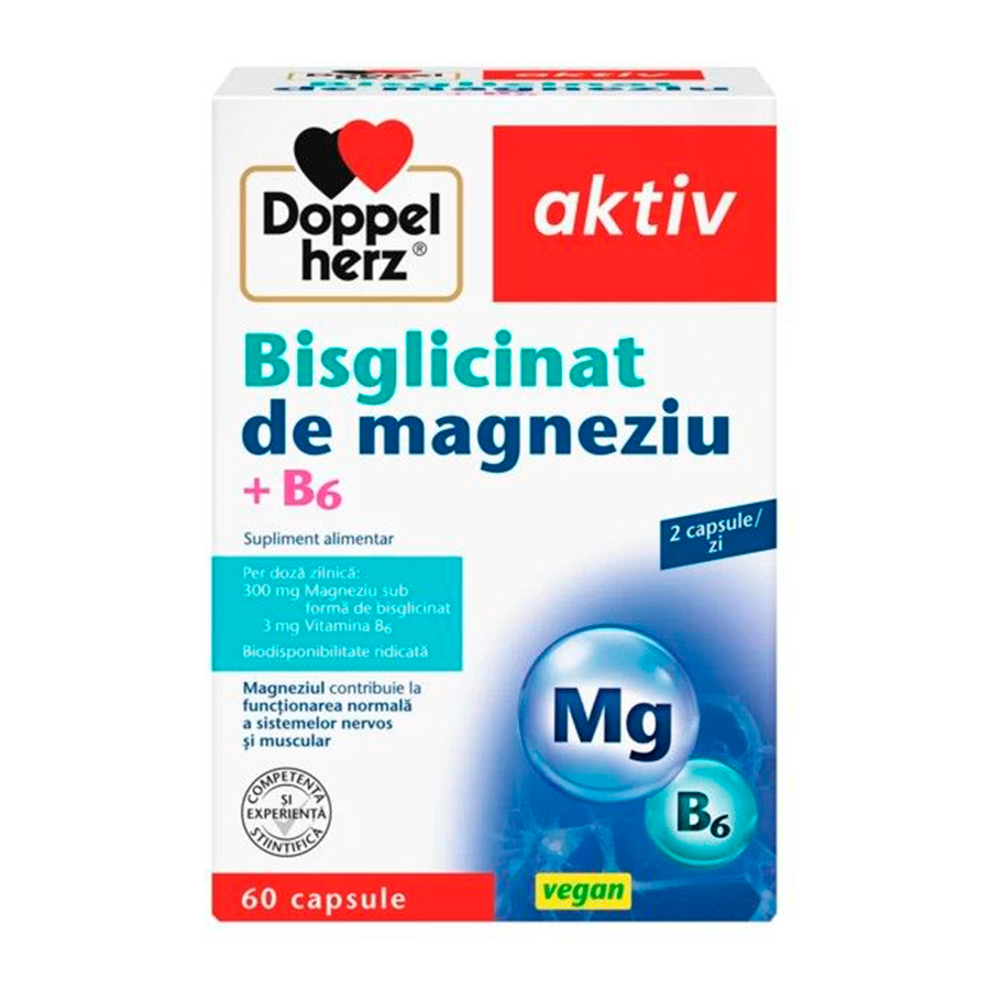 Doppelherz® aktiv Bisglicinat de magneziu + B6 contine, intr-o capsula, 150 mg Magneziu sub forma de bisglicinat de magneziu si 1,5 mg Vitamina B6.