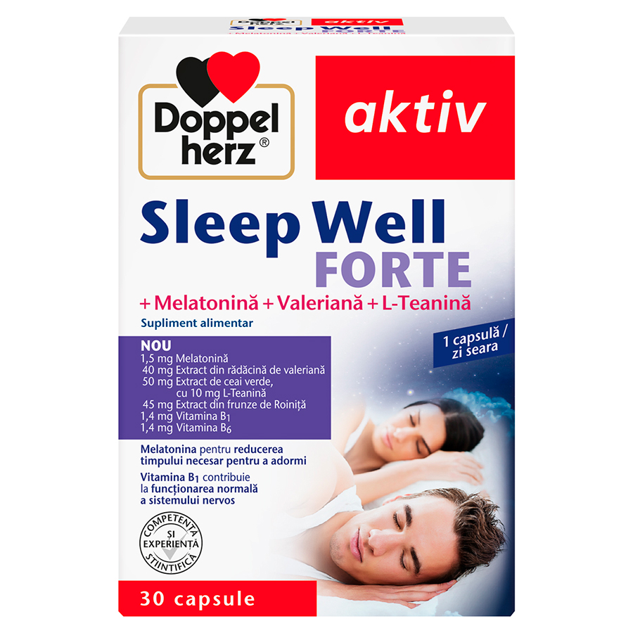 Doppelherz® aktiv Sleep Well FORTE este destinat a fi luat seara, inainte de culcare. Contine Melatonina, „hormonul somnului”, alaturi de Vitaminele B1 si B6, care contribuie la functionarea normala a sistemului nervos si la mentinerea sanatatii psihice.