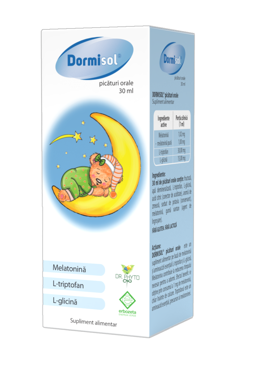 Dormisol picaturi orale, 30ml, producator Erbozeta S.p.A. San Marino, distribuit de Dr. Phyto, este un supliment alimentar pe baza de melatonina si aminoacizii esentiali L-triptofan si L-glicina, cu efect in reducerea timpului necesar pentru a adormi si reglarea bioritmului organismului. Efectul benefic se obtine prin consumul a 1 mg de melatonina, chiar inainte de culcare.
