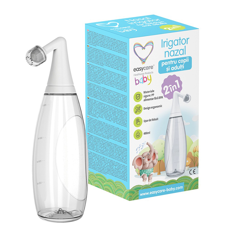 Irigator nazal 2 in 1 Easycare Baby, cu o capacitate de 400 ml, este un dispozitiv medical clasa I, conceput pentru curatarea si igiena cavitatii nazale atat la copii, cat si la adulti. Util pentru respiratie usurata si in caz de congestii nazale.
