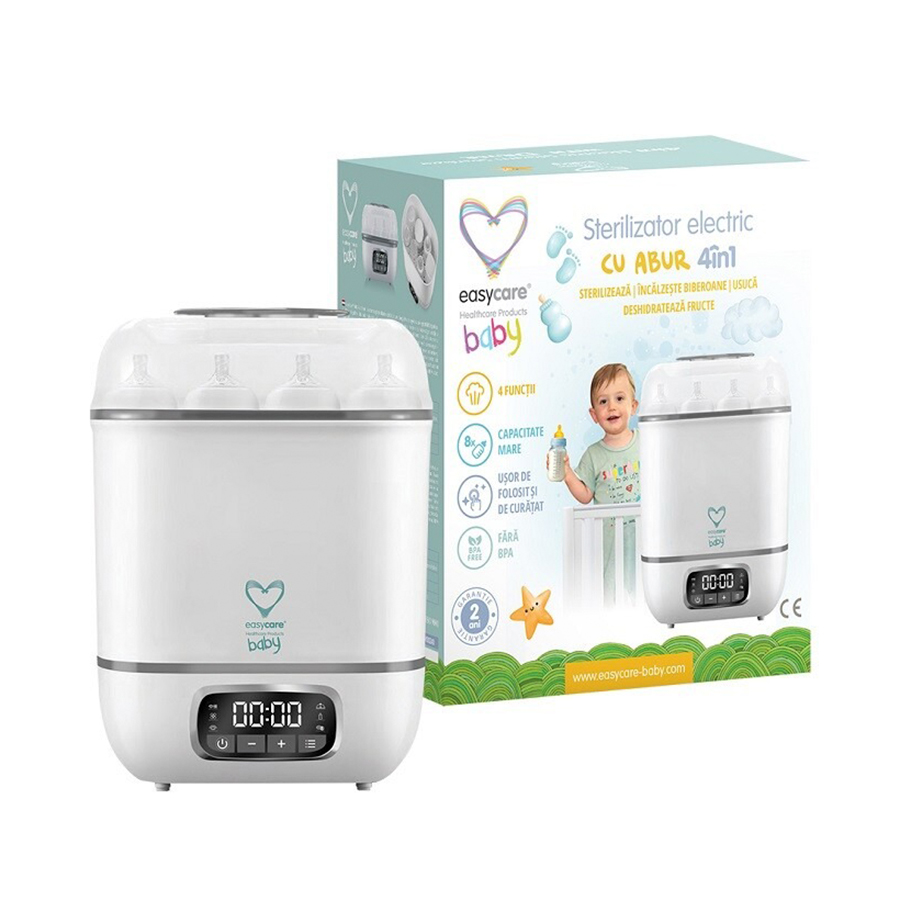 Sterilizator electric cu abur Easycare® Baby 4in1 cu uscator pentru biberoane si alte accesorii pentru bebelusi (cum ar fi suzete, tetine, jucarii mici pentru bebelusi si alte accesorii care pot fi sterilizate): o modalitate moderna si sigura de a steriliza si usca accesoriile de hranire, pentru o crestere sanatoasa a bebelusului tau. In plus sterilizatorul Easycare® Baby are urmatoarele functii suplimentare: mentine temperatura, incalzeste biberoanele si dehidrateaza fructe. Sterilizeaza pana la opt biberoane cu accesorii, in doar 8 minute. Ingust, dar incapator, sterilizatorul Easycare Baby este rapid si eficient. Este usor de utilizat, cu butoane tactile si un afisaj LCD intuitiv. Este usor de curatat si depozitat, deoarece sterilizatorul poate fi dezasamblat usor si rapid, in parti mai mici. Partile componente sunt fabricate din materiale sigure fara BPA sau parabeni. Produsul contine urmatoarele parti componente: capac transparent, raft suzeta, corp, raft sticle, baza, filtru HEPA, capac filtru si manual de utilizare.