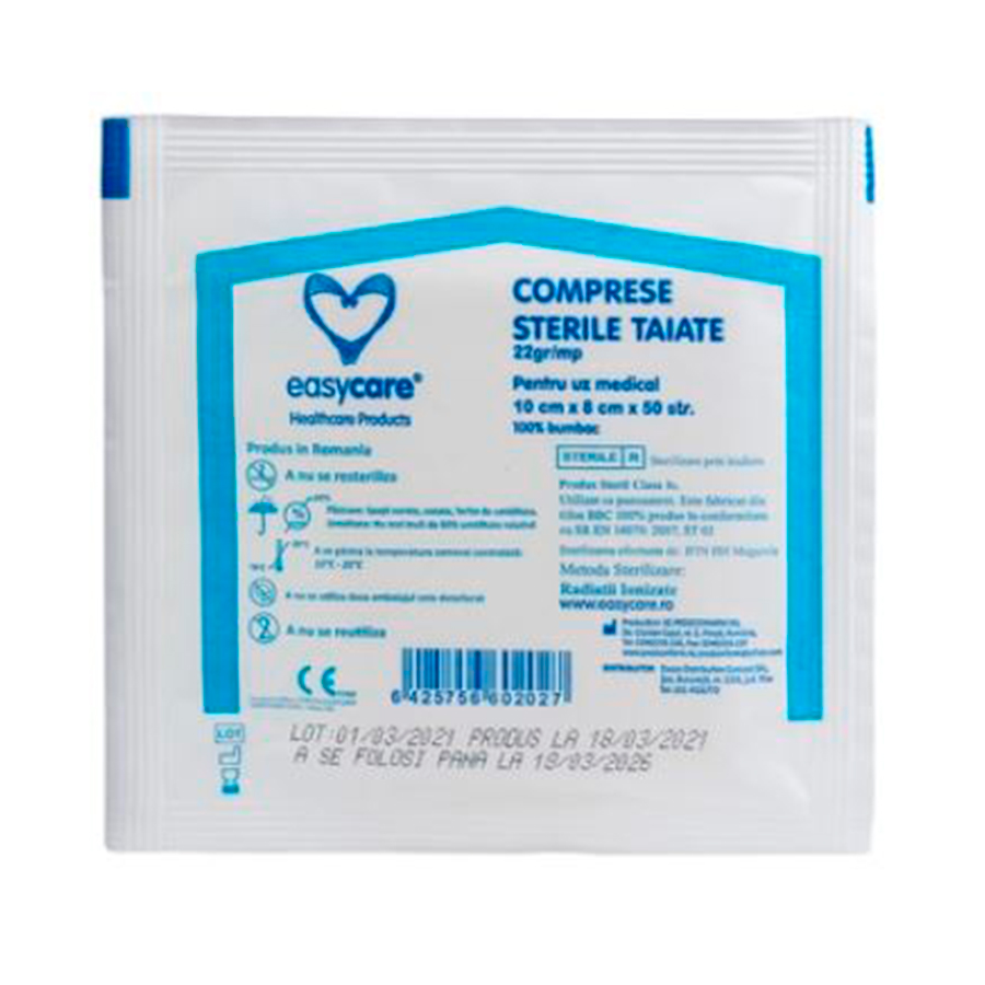 Comprese sterile EASYCARE din tifon, taiate, 100% bumbac, dimensiune 10cmx8cm,25 fasii tifon/pachet si cusatura 26×16. Compresele sterile sunt utile pentru tratamentul general al ranilor (plagilor), in special in tratamentul primar al plagilor contaminate, infectate si cu o cantitate mare de exsudat. Adecvate ca pansamente in chirurgia minora, atat in ambulatoriu, cat si pentru pacientii internati. Totodata sunt destinate uzului cosmetic sau medical la domiciliu. Sterile, ambalate in blistere cu fereastra transparenta.