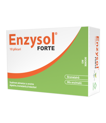 Enzysol Forte pulbere, 10 plicuri, producator Erbozeta S.p.A. San Marino, distribuit de Dr. Phyto, este un supliment alimentar pe baza de enzime digestive si bromelaina, destinat procesului digestiv. Enzimele ajuta la descompunerea alimentelor in compusi mai simpli, facilitand absorbtia nutrientilor. Bromelaina, o enzima proteolitica, contribuie la metabolizarea proteinelor alimentare.
