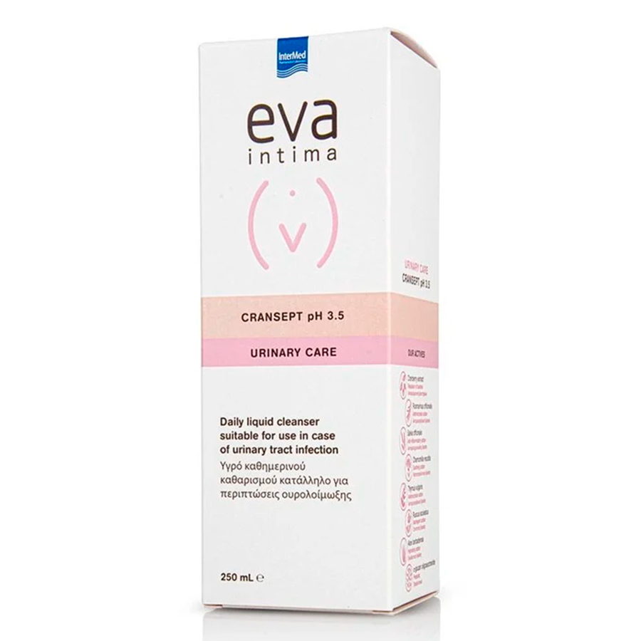 Lichidul de curatare zilnic fara sapun Eva Intima Wash CranSept, 250 ml, produs de Ioulia & Irene Tsetis Pharmaceutical Laboratories (INTERMED), are un pH de 3.5 si este compatibil cu fiziologia zonei intime a femeilor de toate varstele. Curata prin indepartarea secretiilor si mirosurilor fara a usca sau irita pielea, lasand o senzatie de prospetime si curatenie. Recomandat in cazurile in care este necesara o protectie antimicrobiana intensa din cauza aparitiei infectiilor urinare recurente.