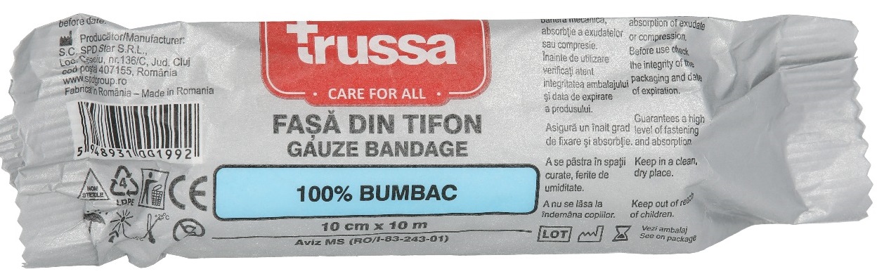Fasa tifon este fabricata din 100% bumbac si asigura un inalt grad de fixare a pansamentelor, dar si absorbtie a eventualelor fluide care traverseaza pansamentele.