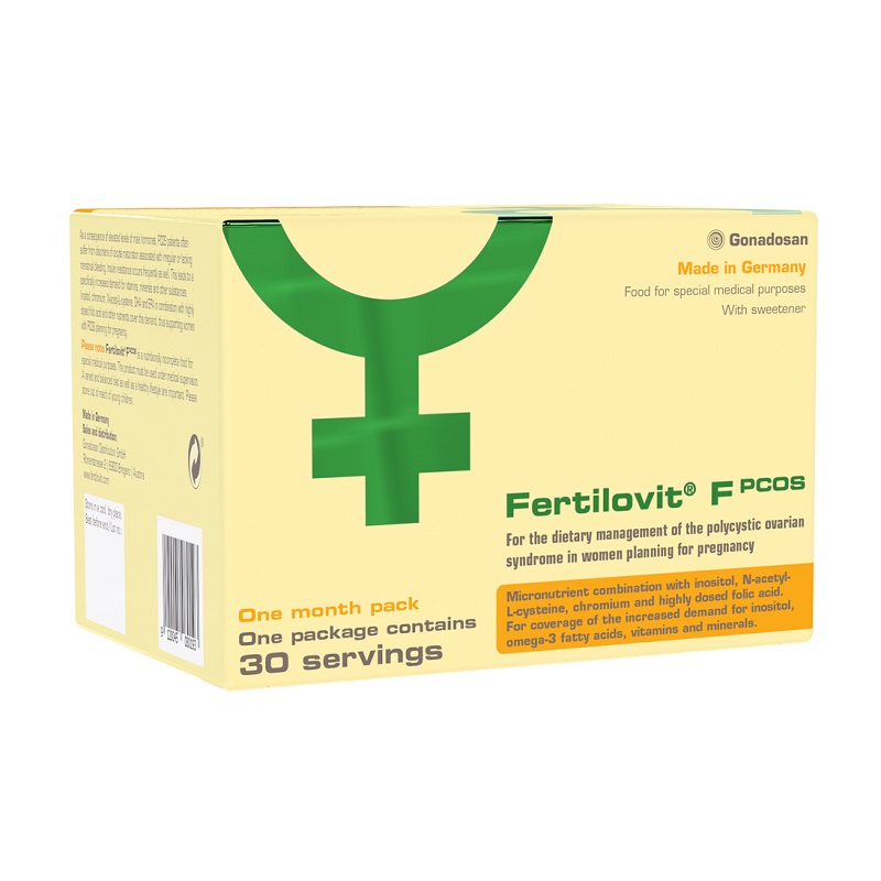 Fertilovit F PCOS, 30 doze zilnice, Gonadosan, Elvetia/Austria, este un supliment alimentar destinat managementului nutritional al sindromului ovarelor polichistice (PCOS) al femeilor care isi planifica o sarcina, prin acoperirea nevoilor crescute de inozitol, acizi grasi Omega-3, vitamine si minerale. Aceasta combinatie de micronutrienti contribuie la mentinerea unui nivel echilibrat al glucozei in sange si la sustinerea echilibrului hormonal ovarian: