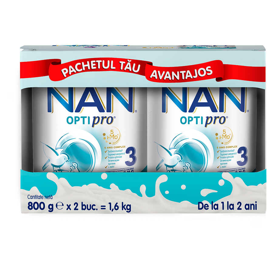 Nestlé NAN OPTIPRO 3, cu 5 HMO, produs pe baza de lapte, fortifiat. Produs premium sub forma de pudra, de la 1 an, 1.2 kg. NAN OPTIPRO 3 este dezvoltat pe baza cercetarilor Nestlé in domeniul nutritiei si sanatatii copiilor
