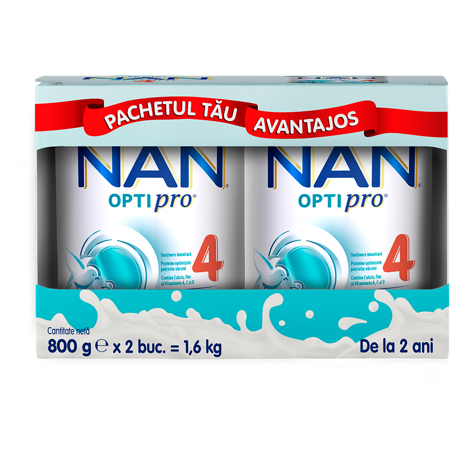NAN OPTIPRO 4 este o formula de lapte praf destinata copiilor de varsta mica de la 2 ani, ca parte lichida a alimentatiei, dezvoltata pe baza cercetarilor Nestlé in domeniul nutritiei si sanatatii copiilor. Laptelel NAN contine o combinatie unica de ingrediente, sustinand o buna dezvoltare fizica si mentala a copilului tau in aceasta etapa, ajutand astfel la oferirea unei baze puternice pentru viitorul sau.
