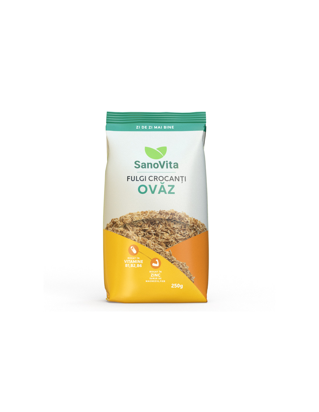 Fulgi crocanti de ovaz, 250 g, produs de Sano Vita, Romania, bogati in mod natural in carbohidrati, fibre de buna calitate si proteine.