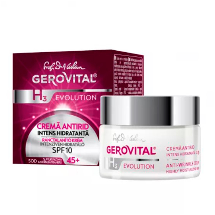 Gerovital H3 Prof. Dr. Ana Aslan Evolution Crema Antirid Intens Hidratanta SPF 10 este o combinatie tintita de ingredienti multifunctionali care asigura efectul antirid, hidratare intensa, protectie impotriva radiatiilor UV.