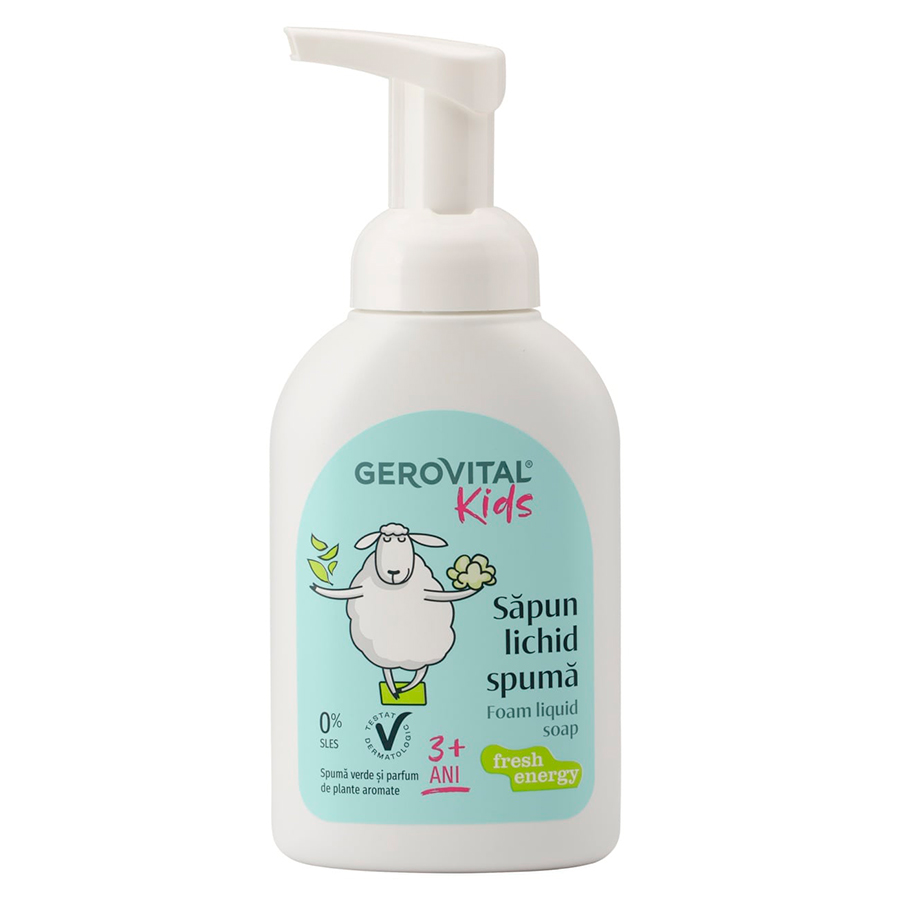 Gerovital Kids Sapun Lichid Spuma Fresh Energy este formulat ca o spuma verde, iar parfumul de plante aromate transforma igiena mainilor intr-o rutina jucausa, care tine microbii departe. Formula respecta pH-ul pielii, contine Glicerina, D-Panthenol si extract de Aloe Vera cu proprietati emoliente si hidratante. Nu contine SLES.