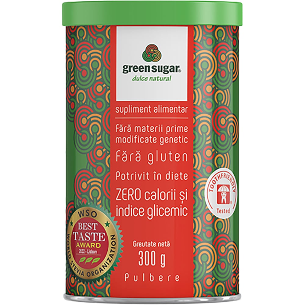 Green Sugar® Pulbere 300 g, Laboratoarele Remedia, Romania, este un indulcitor 100% natural cu zero calorii, zero indice glicemic, pe baza de Stevia rebaudiana. Recomandat in curele de slabire sau in cadrul unei alimentatii echilibrate si sanatoase, dar si persoanelor care sufera de diabet, fenilcetonurie, sindrom de colon iritabil si colita de fermentatie. Poate fi consumat in perioada sarcinii si alaptarii.
