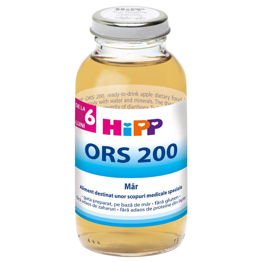 HiPP Ors 200 Mar 6+ , 200 ml, produs de HiPP Germania, este o solutie de rehidratare pe baza de mar, pentru copii peste 6 luni. Are un continut nutritional special formulat pentru a reface pierderile de apa si saruri, in cazul deshidratarii usoare sau moderate datorate varsaturilor sau episoadelor diareice.