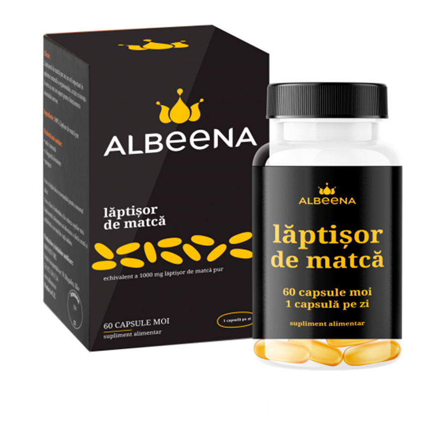 Laptisor de matca ALBeeNA – capsule moi, reprezinta un produs apicol 100% natural, cu o concentratie ridicata de acetilcolina si acidul 10-hidroxi-2-decenoic (acid 10-hda) plus o gama complexa de nutrienti esentiali folositori pentru buna functionare a organismului. Acetilcolina si acidul 10-hda, alaturi de vitamine (C, B1, B2, B6, B12), minerale (calciu, potasiu, sodiu, magneziu, fier, cupru, mangan), proteine, lipide, glucoza, zaharoza, fructoza, apa fac parte din compozitia chimica de baza a laptisorului de matca. O capsula de Laptisor de matca ALBeeNA contine 334 mg laptisor de matca liofilizat, echivalentul a 1000 mg laptisor de matca pur.