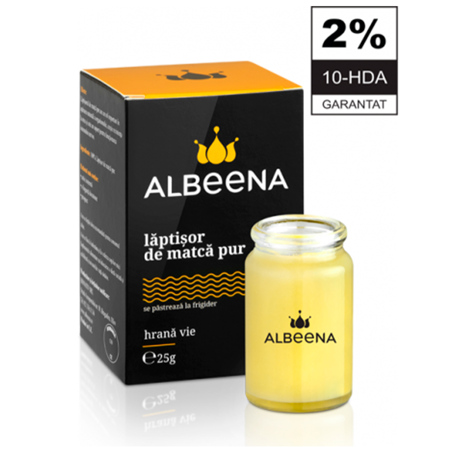 - Contine substanta activa: Acid 10-HDA (acid 10-hidro-2-decenoic) prezenta exclusiv in laptisorul de matca pur, cu efect antibacterian, antiviral, antifungic si contribuie la buna functionare a sistemului imunitar.
