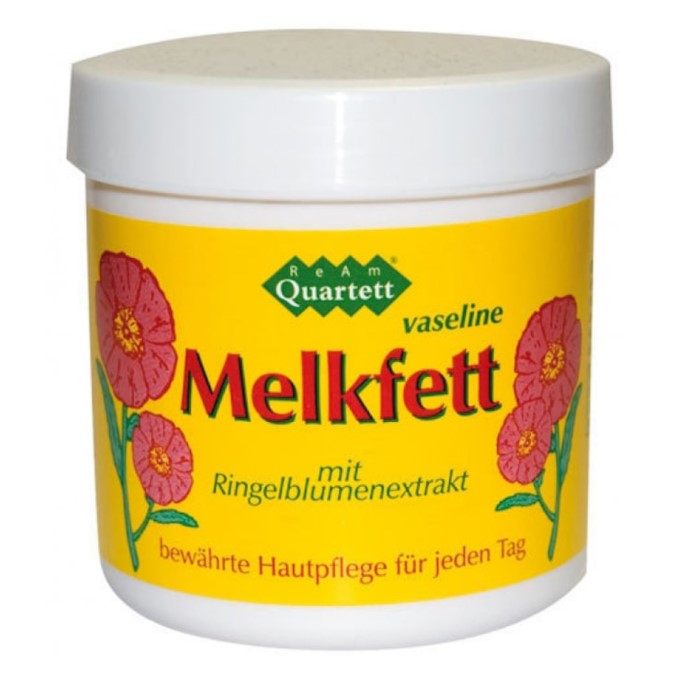 Melkfett - Unguentul cu galbenele, 250 g, produs de Ream Quartett, Germania, este recomandat pentru protectia pielii intregului corp. Cu extract de galbenele, este indicat pentru ingrijirea si hranirea pielii mature, deosebit de uscate, sensibile si la tratarea pielii crapate. Unguentul formeaza un film protector, regland continutul de substante hidratante ale pielii. Este considerat una din cele mai vechi metode de ingrijire a pielii.