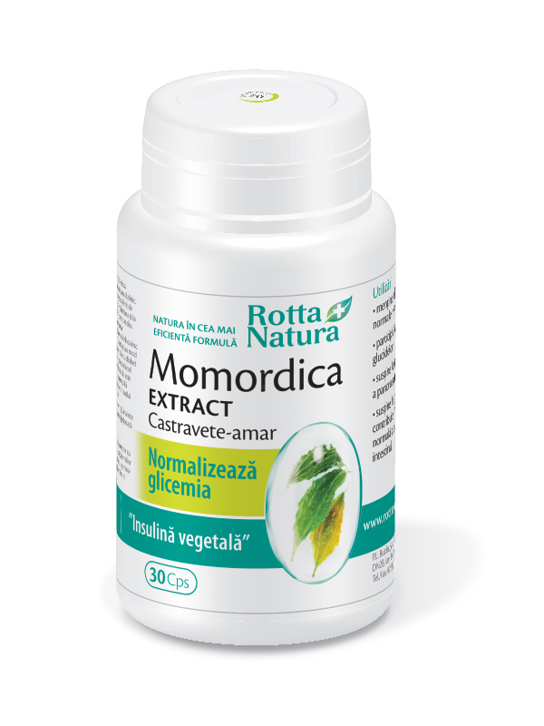 Suplimentul Momordica extract 30 capsule, produs de Rotta Natura, Romania, este destinat persoanelor cu diabet de tip II, cu probleme ale pancreasului sau dislipidemie. Extractul de Momordica Charantia (castravetele amar) ar capacitatea de a normaliza glicemia cu ajutorul celor 17 aminoacizi, dintre care 16 sunt comuni cu aminoacizii care compun insulina, prin cresterea ratei de utilizare a glucozei si prin inhibarea proceselor de sinteza a acesteia. In plus, are si capacitatea de protectie si regenerare a celulelor beta-pancreatice.
