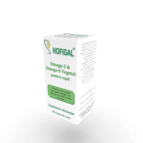 Omega-3 + Omega-6 Vegetal pentru copii, 60 capsule, Hofigal, Romania, este o sursa directa de acizi grasi Omega-3 si Omega-6 pentru copii, intr-un raport optim, echilibrat, fara metale grele, net superior uleiului de peste, hraneste creierul si creste coeficientul de inteligenta la copii.