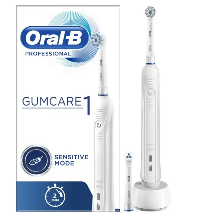Periuta de dinti electrica ORAL-B PRO1 D16, Procter & Gamble Distribution, cu incarcare la priza, este destinata persoanelor adulte cu dinti si gingii sensibile. Curata cu delicatete smaltul si maseaza gingiile, protejand astfel sanatatea orala. Dispozitivul Oral-B Professional elimina semnificativ mai multa placa bacteriana comparativ cu o periuta manuala, datorita senzorului de presiune acustic si a celor doua tipuri de capete cu care este dotat: capatul de periaj Sensitive Ultra-Thin, special conceput pentru a proteja linia gingivala, si capatul Interdentar care contribuie la o curatare eficienta a spatiilor interdentare.
