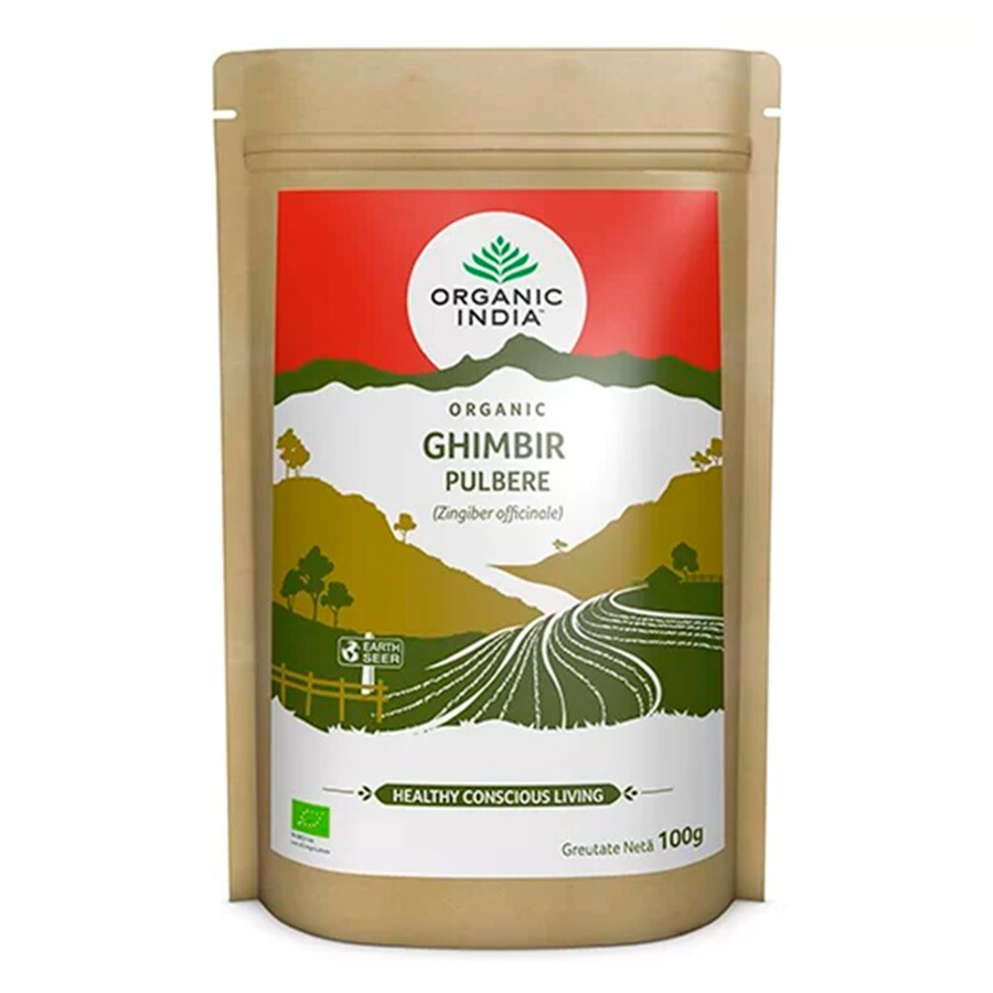 ORGANIC INDIA Ghimbir Certificat Ecologic Pudra 100g Fara Gluten este un produs 100% Certificat Organic si nu contine organisme modificate genetic. Nu contine si nu sunt folosite in niciun stagiu al productiei pesticide sintetice, erbicide, ingrasaminte sau alte tratamente chimice.