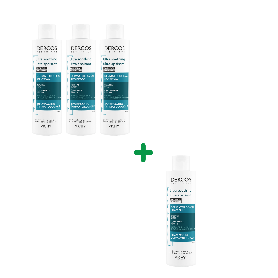 Cumpara pachetul Dercos sampon ultracalmant pentru scalp sensibil gras si primesti a-4 a cutie gratuit. Campania este valabila in perioada 01-31.12.2025, in limita stocului disponibil.
