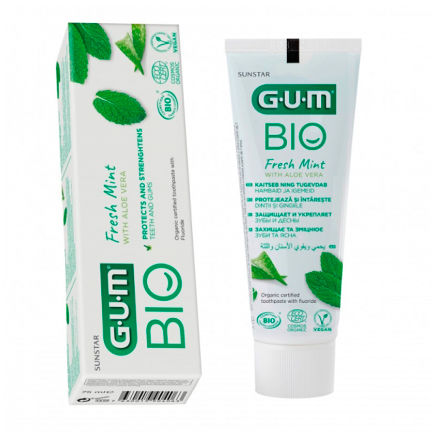 Pasta de dinti Gum Bio, cu fluor, ajuta la oprirea aparitiei cariilor dentare, improspateaza respiatia, intareste smaltul, fortifica dintii si gingiile.