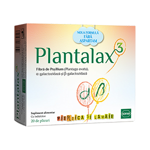 Plantalax este un supliment alimentar pe bază de fibre Psyllium (Plantago ovata) și enzime: α-galactozidază și β-galactozidază.