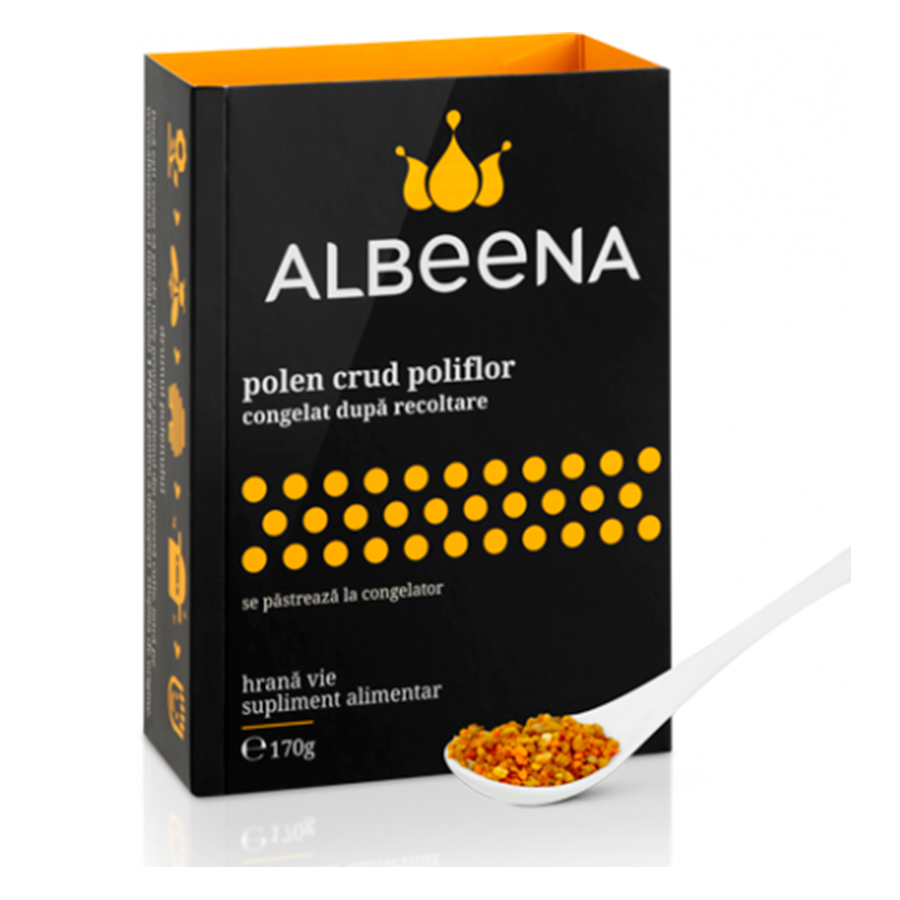 Polenul crud de la Albeena este un produs apicol organic, provenit de la stupinele din regiunile deluroase nepoluate ale Transilvaniei. Proaspat recoltat si congelat imediat, astfel incat sa isi pastreze intacte proprietatile si calitatile curative. Polenul poliflor pur de la Albeena este un superaliment viu, complet nutritional si diferit fata de alte tipuri de polen de pe piata: are o textura cremoasa si un gust placut, dulce-floral.
