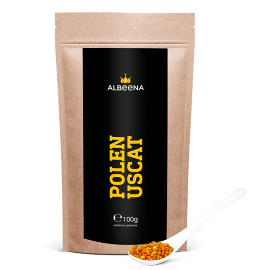 100% polen uscat la temperatura controlata, in uscatoare speciale care asigura pastrarea enzimelor si a nutrientilor esentiali. Disponibil in pungi etanse de 100g si 200g.