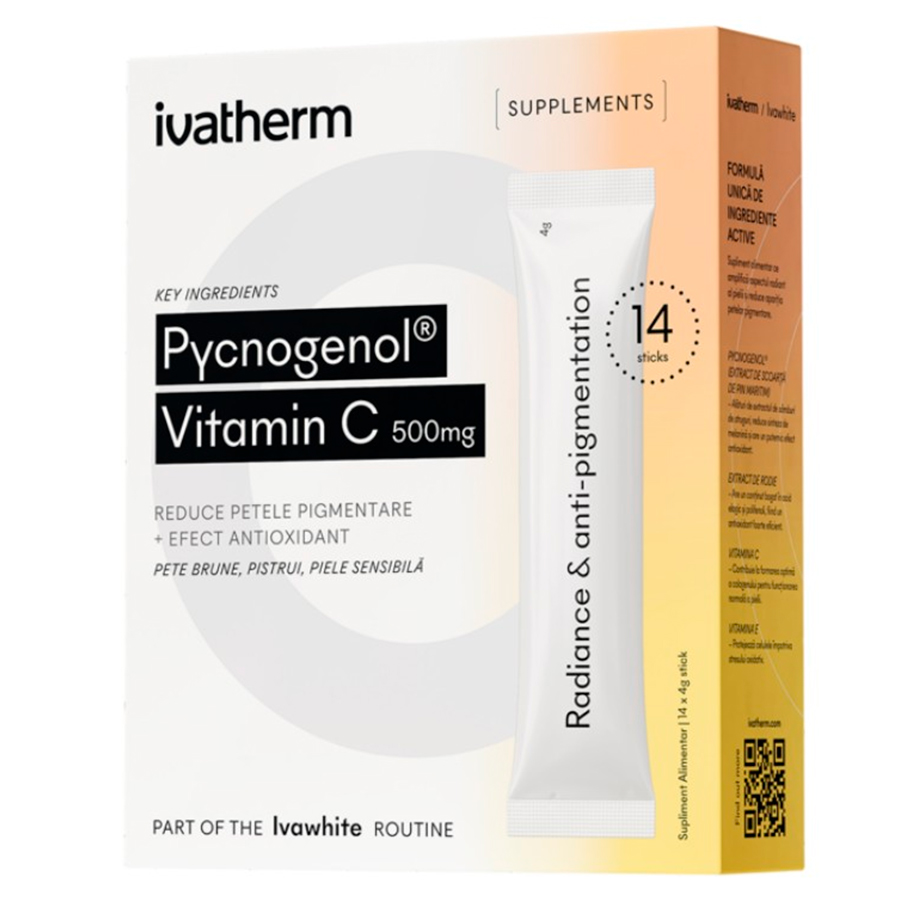 Impreuna cu produsele din gama Ivawhite, Pycnogenol Vitamin C 500mg - un extract din scoarta de pin maritim francez cu puternic efect antioxidant, ofera luminozitate si stralucire pielii, contribuind la diminuarea petelor pigmentare. In 1940, cercetatorul Jacques Masquelier a inceput sa studieze proprietatile terapeutice ale scoartei de pin maritim, inspirat fiind de populatiile indigene din America de Nord, care il foloseau in vindecarea ranilor si in combaterea scorbutului, afectiune ce apare din cauza aportului insuficient de vitamina C. Studiile actuale arata ca extractul de scoarta de pin maritim protejeaza impotriva radicalilor liberi si are un puternic efect fotoprotector si antiinflamator. Pentru rezultate optime, amesteca continutul unui plic in 150 ml de apa sau in bautura preferata si consuma 1/2 plicuri pe zi, timp de cel putin 3 luni.