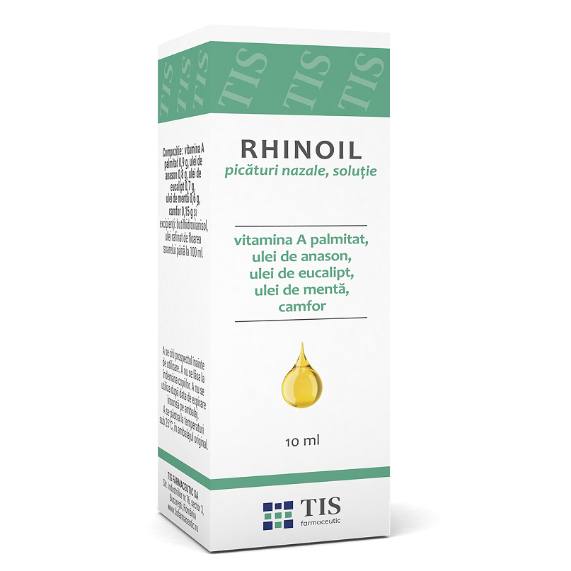 Picaturile nazale 100 ml RHINOIL contin: vitamina A palmitat 0.9 g, ulei de anason 0.8 g, ulei de eucalipt 0.7 g, ulei de menta 0.6 g, camfor 0.15 g si excipienti.