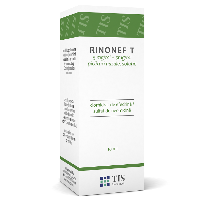 10 ml RINONEF-T, picaturi nazale contin: clorhidrat de efedrina 50 mg, sulfat de neomicina 50 mg si excipienti.