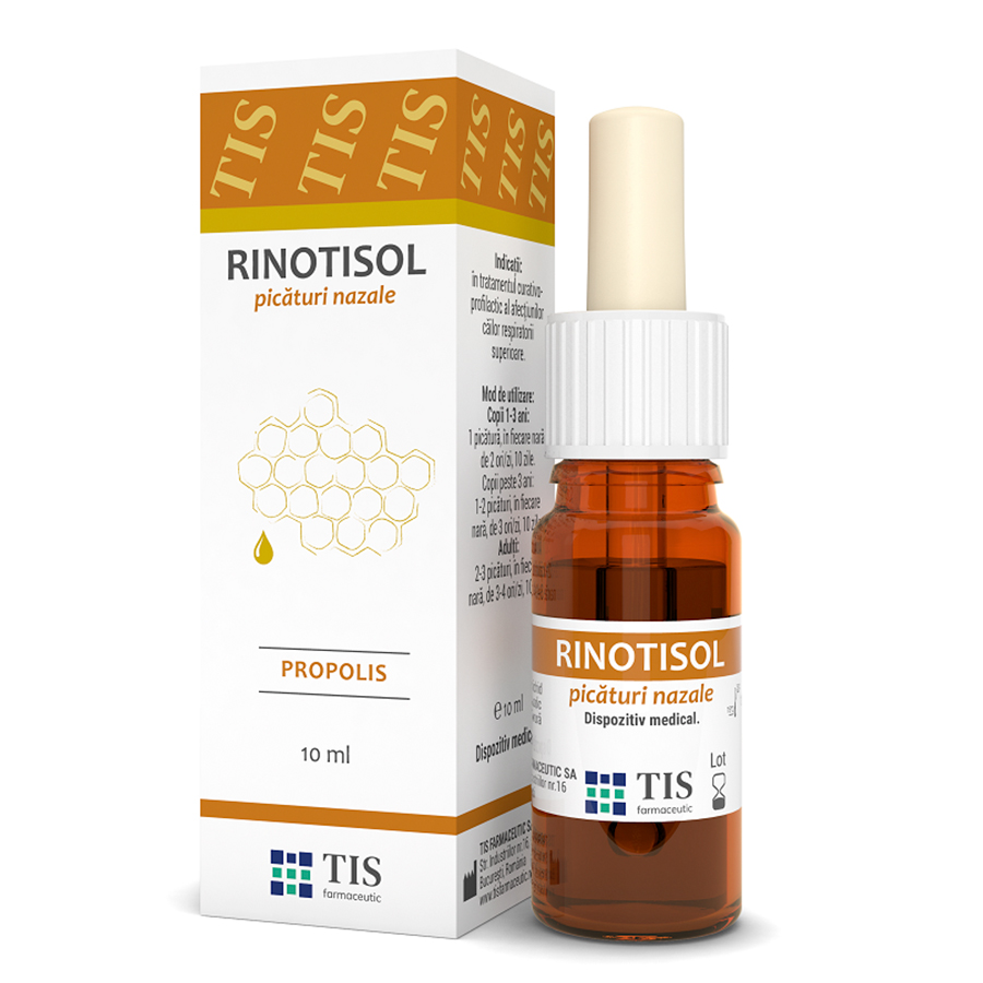 Rinotisol, picaturi nazale contine extract apos de propolis, bogat in principii active hidrosolubile, cu actiune antiinflamatoare si cicatrizanta.