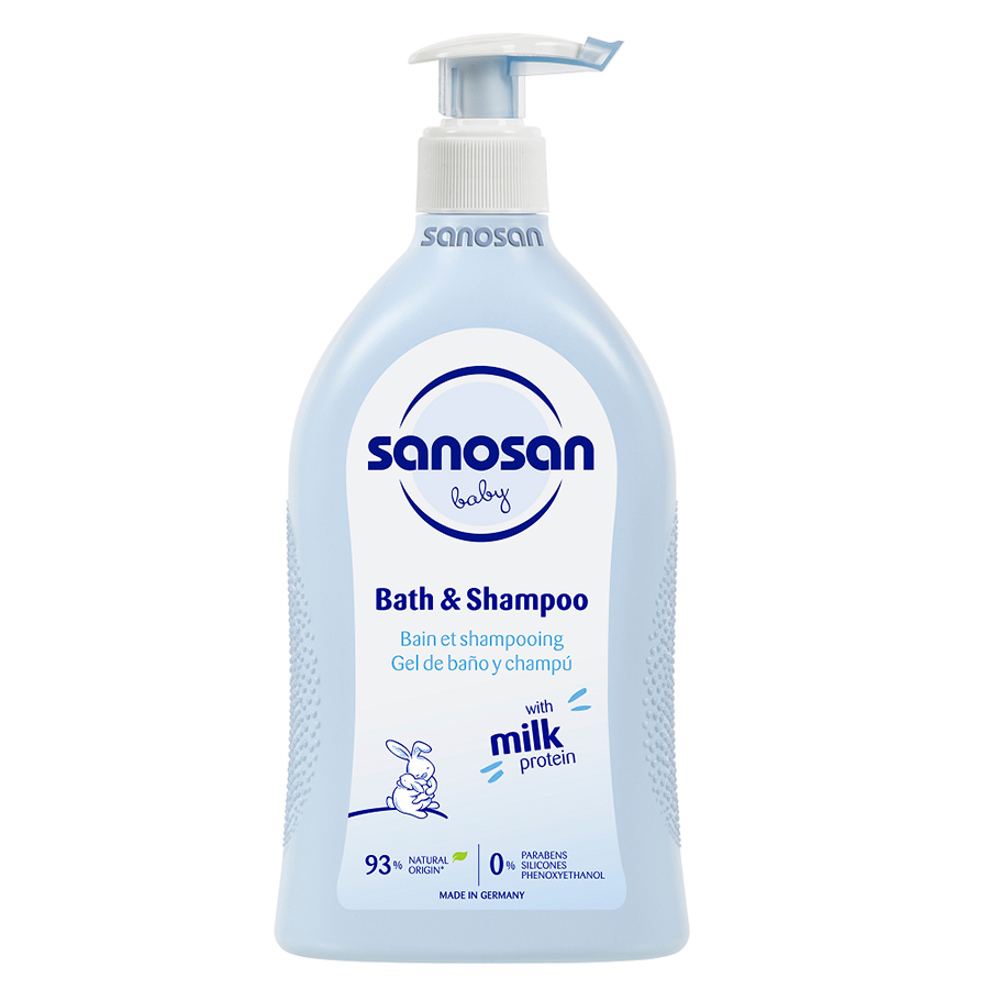 SANOSAN SPUMANT SI SAMPON - Pielea delicată necesită curățare blândă. Îmbogățită cu extract organic de măsline și proteine din lapte, această formulă de îngrijire blândă curăță cu grijă pielea bebelușului și a scalpului și dă părului un luciu mătăsos. Păstrează mantaua de acid natural a pielii delicate a copilului și sprijină funcția de protecție naturală a pielii. Formula naturală nu conține ulei de parafină, coloranți, siliconi sau parabeni. Compatibilitatea cu pielea a fost confirmat clinic. Recomandat de moașe. Siguranța pe primul loc: compatibilitate remarcabilă cu pielea bebelușilor – testată clinic