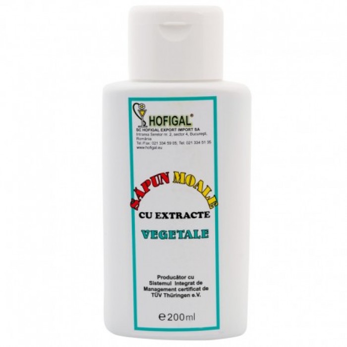 Sapunul vegetal lichid, 200 ml, de la Hofigal, Romania, este un sapun moale, cu saruri de potasiu, realizat din ingrediente naturale, respectiv extracte de plante, inclusiv extractele foliare ale acestora, pentru proteinele vegetale si acizii grasi naturali.