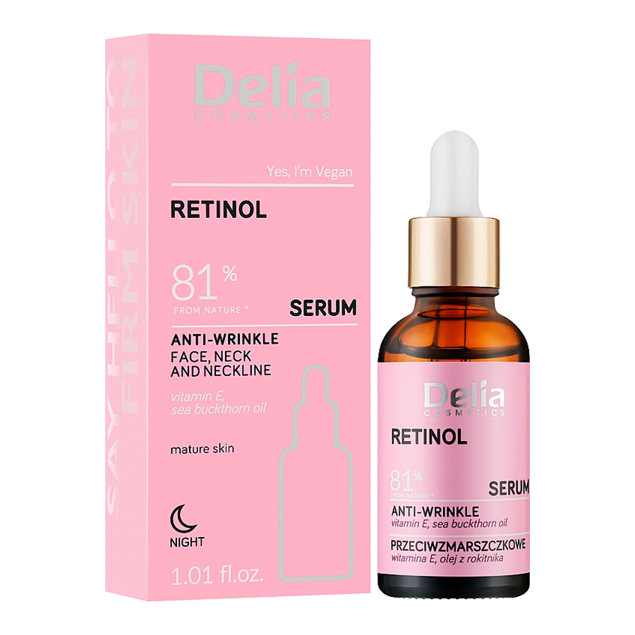 Ser cu retinol pentru fata, gat si decolteu, cu o formula inalt concentrata. Contine 81% ingrediente de origine naturala. Efectul utilizarii serului cu retinol este de reducere vizibila a ridurilor si sporire a fermitatii pielii, de regenerare si hranire a pielii care isi recapata aspectul tineresc.