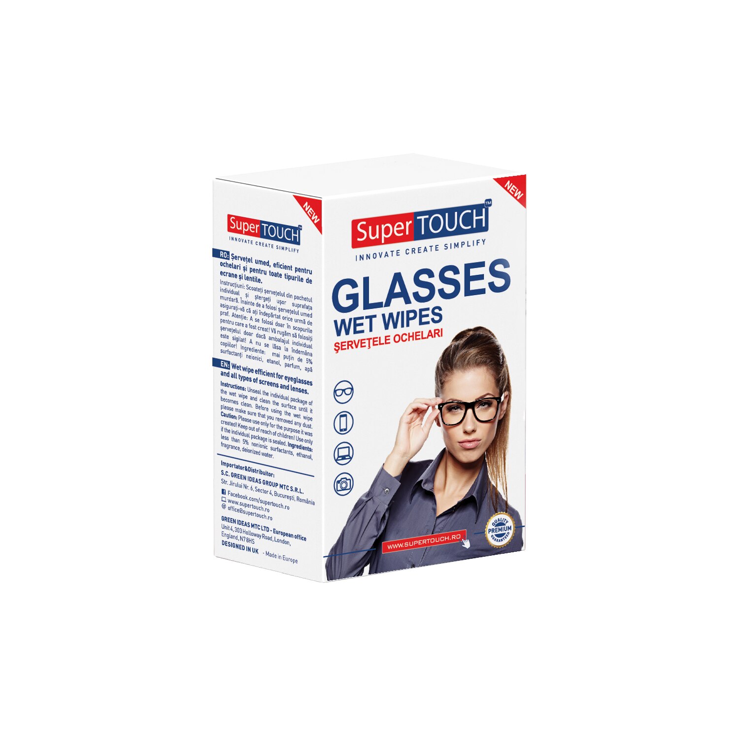 Servetele pentru curatat ochelarii, ambalate individual; curata si lustruiesc lentile si orice suprafete de plastic sau sticla; efect antistatic, antimagnetic, antidegresiv, nu ataca stratul antireflex. Se folosesc pentru ochelarii de vedere si soare, lentile foto si video, oglinzi auto-moto, telefoane celulare, CD-uri, ecrane de monitor.