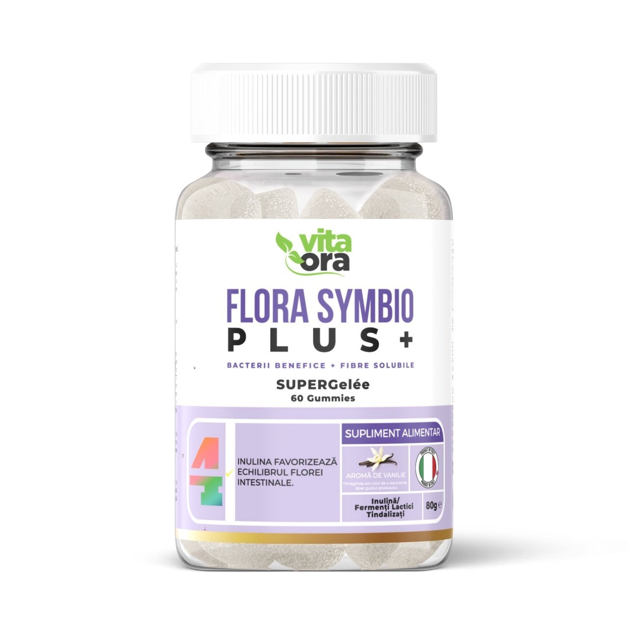 Flora Symbio Plus+ SUPERGelée este un supliment alimentar sub forma de jeleuri cu aroma de vanilie, formulat pentru sustinerea sanatatii digestive si mentinerea echilibrului florei intestinale. Contine Inulina, o fibra prebiotica, si Fermenti Lactici Tindalizati, care contribuie la buna functionare a sistemului digestiv, in special in perioadele de stres sau dupa cure de antibiotice.