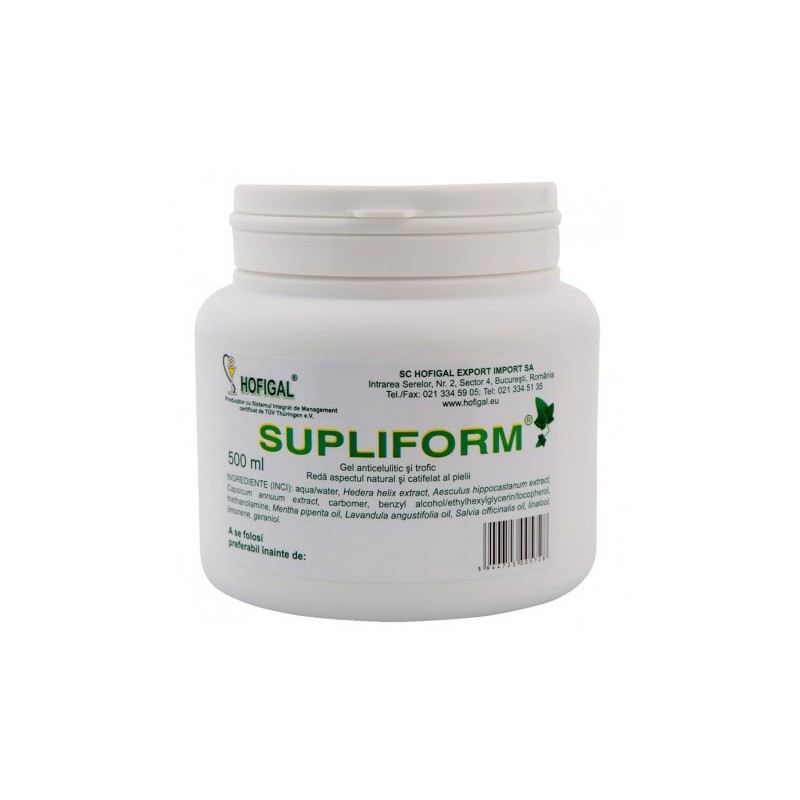 Supliform ®, 500 ml, Hofigal, Romania, este un produs cosmetic natural de intretinere corporala care, datorita substantelor bioactive si efectelor lor sinergice, reface potentialul biologic al pielii si contribuie la mentinerea sanatatii acesteia.