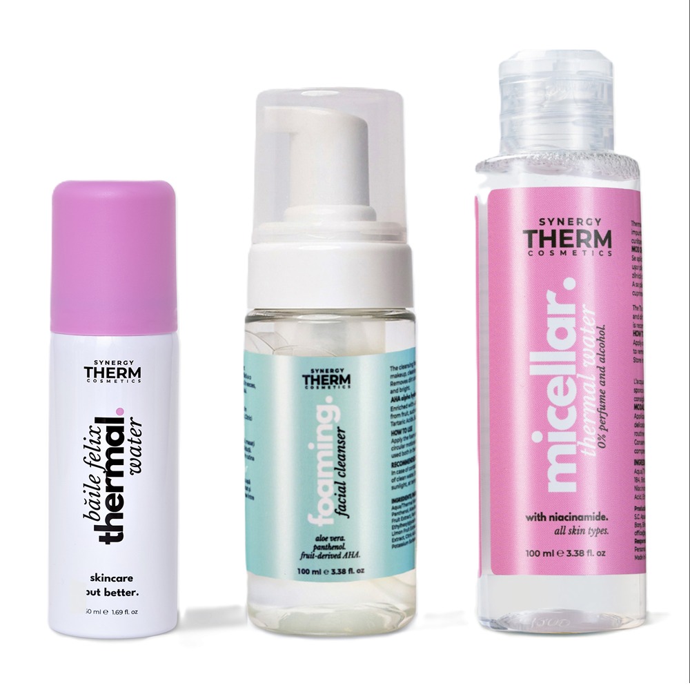 Synergy Therm Mini Travel Kit - Spuma curatare, 100 ml + Apa termala micelara, 100 ml + Apa termala Baile Felix, 50 ml, Synergy Therm